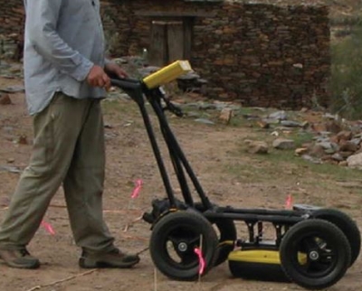 GeoradarEl georadar permite de ver hasta 5 metros debajo el nivel del suelo. Es un técnica que se usa durante los trabajos de prospección porque detecta muros, estructuras en piedras, fundaciones… Del trabajo de prospección se saca secciones verticales que permiten luego de optimizar las excavaciones para saber de manera más precisa donde se puede excavar o donde no se puede excavar. |